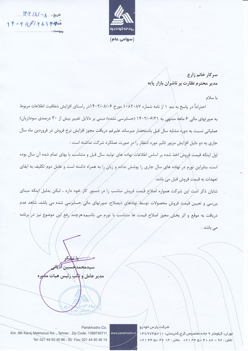 مدیران ارشد پارس خودرو در نامه ای که به مدیر نظارت بر بازار پایه سازمان بورس و اوراق بهادار نوشتند دلیل این افزایش زیان بیش از 30 درصدی را توضیح دادند.