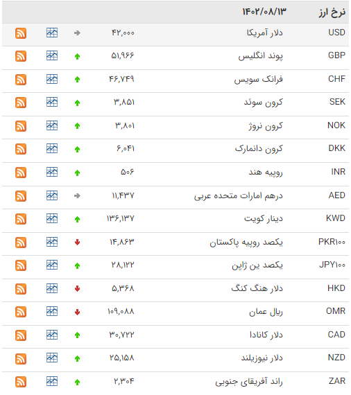 بانک مرکزی امروز ‌شنبه ۱۳ آبان ۱۴۰۲، نرخ رسمی ۴۶ ارز را اعلام کرد که بر اساس آن نرخ ۲۸ ارز افزایش و نرخ ۹ ارز کاهش یافت، نرخ باقی ارزها ثابت ماند.