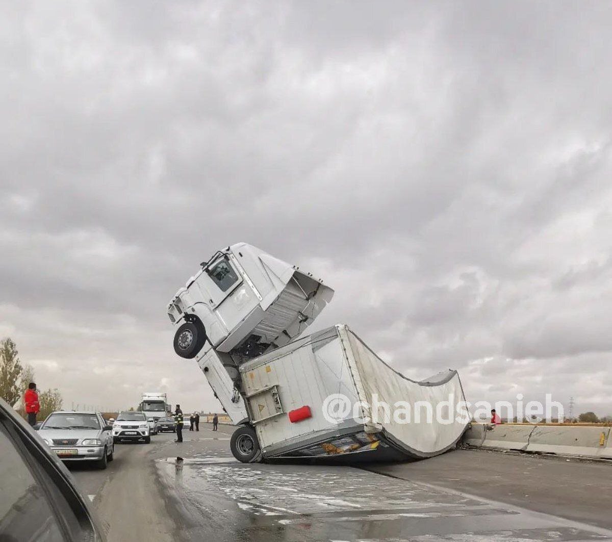 تصویری عجیب از پرواز یک تریلی در اتوبانی در اراک! + عکس
