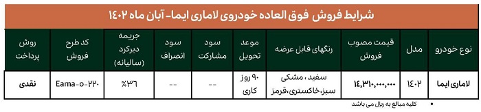 از سه شنبه، طرح فروش فوری با قیمت قطعی خودرو لاماری ایما در پنج رنگ ویژه آبان 1402 آغاز می شود.