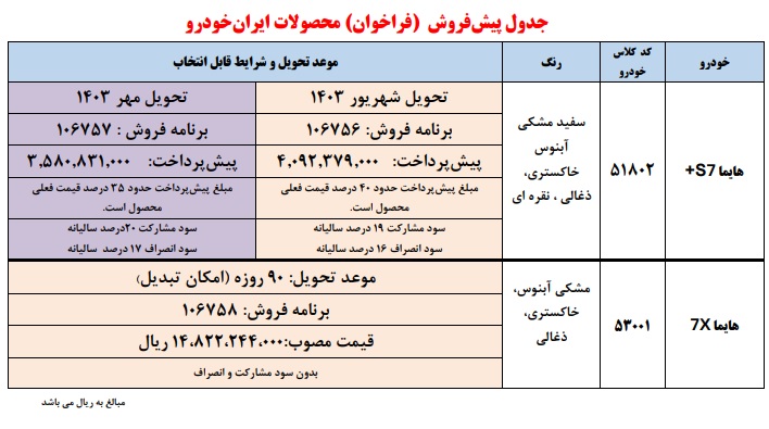 ایران خودرو شرایط پیش فروش هایما S7 ویژه آبان 1402 را که از یکشنبه آغاز می شود را اعلام کرد.