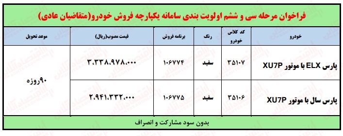 ثبت نام ایران خودرو مربوط به پژو پارس ELX (با موتور XU۷P) و پژو پارس سال (موتور XU۷P) است. این خودروها ۹۰ روزه تحویل مشتریان خواهد شد. متقاضیان ثبت نام پژو پارس ۱۴۰۲ باید کل مبلغ را در یک مرحله واریز کنند. جزییات بیشتر را در تصویر زیر بخوانید.