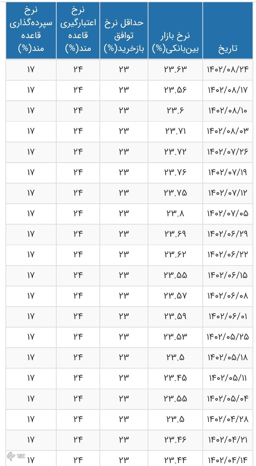طبق اعلام بانک مرکزی نرخ بهره بین بانکی در هفته منتهی به 17 آبان ماه، 23.56 درصد بوده است. این نرخ 10 آبان ماه، 23.60 درصد و این نرخ در هفته منتهی به 3 آبان ماه، 23.71 درصد بوده است. نرخ بهره بین بانکی در هفته منتهی به 26 مهرماه، 23.72 درصد بود. این نرخ در هفته منتهی به 19 مهرماه به 23.76 درصد، هفته پیش از آن 23.75 درصد بوده است.