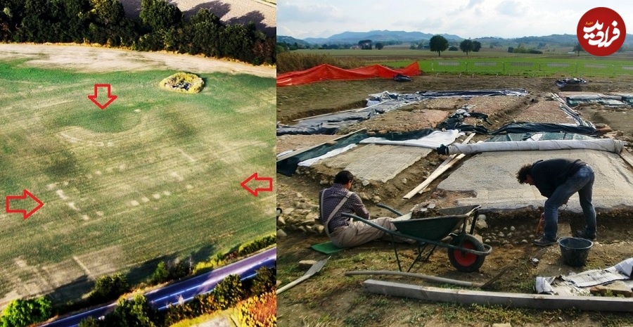 سمت چپ: طرح ویرانه‌هایی که از زیر زمین به چمن فشار می‌آورند. سمت راست: کاوش باستان‌شناسی در حال انجام