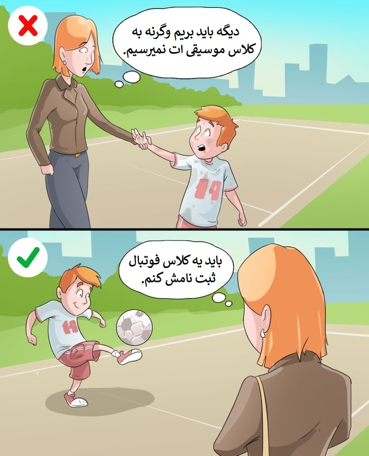 مثلاً والدین دل شان می خواهد فرزندشان ساز زدن را یاد بگیرد و حاضرند ۳ بار در هفته او را تا آن سر شهر به کلاس موسیقی ببرند. پدر و مادرها اغلب به طور ناخودآگاه سعی می کنند سرگرمی ای را به فرزندشان تحمیل کنند.