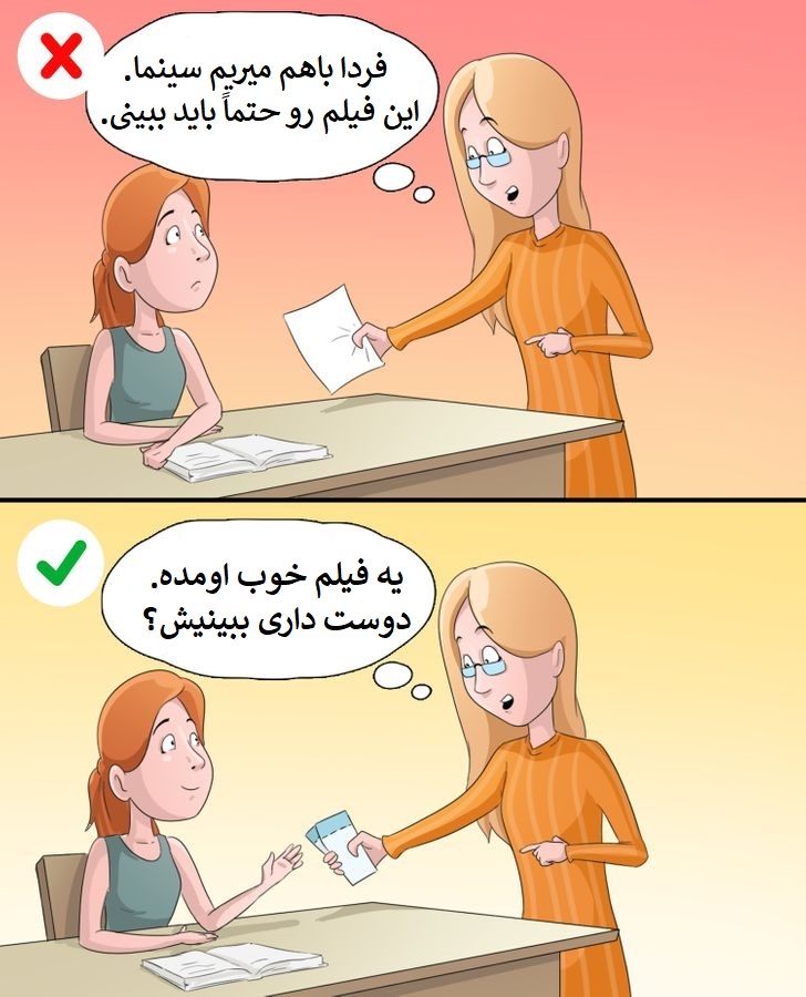 پدر و مادرها اغلب سعی می کنند سلیقه ی خود در زمینه ی کتاب، موسیقی و پوشش را به فرزندشان تحمیل کنند. نیت بدی از این کار ندارند، اما این رفتار فردیت فرزندشان را از او می گیرد. و در بسیاری از موارد، فرزند را به لجبازی سوق می دهد که تلاش می کند دقیقاً بر عکس خواست والدینش عمل کند.