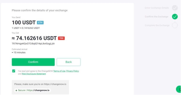 ابتدا وارد سایت شده و در صفحه اصلی تتر ERC20 را در قسمت You Send یا مبدأ و تتر TRC20 را در قسمت You Get یا مقصد انتخاب کنید. کارمزد این مبادله با توجه به بلاکچین مبدأ (اتریوم) تعیین شده و به شما نمایش داده می‌شود. پس از تأیید گزینه Exchange را انتخاب کنید.