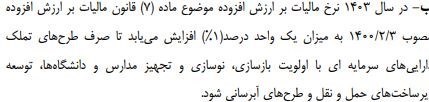 طبق لایحه بودجه سال ۱۴۰۳، مالیات بر ارزش افزوده که تا کنون ۹ درصد بهای تمام شده ی کالا بود با افزایشی ۱ درصدی به ۱۰ درصد رسید.