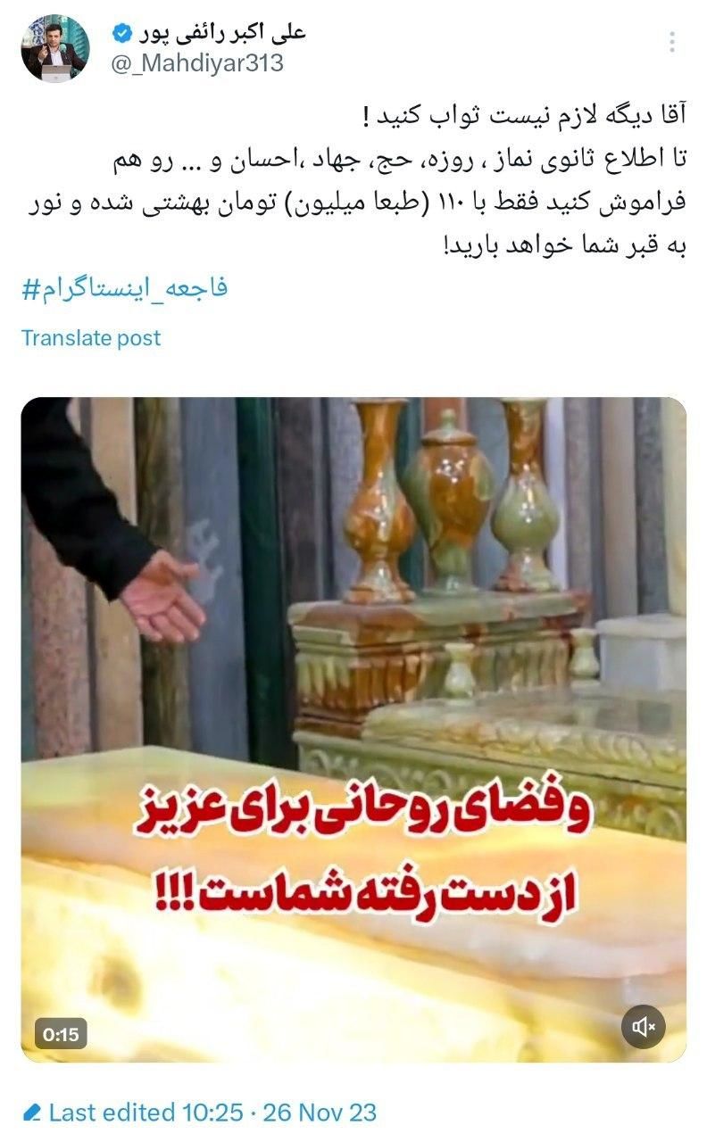 در تصویری که رائفی پور در فضای مجازی به اشتراک گذاشته، این نظریه پرداز ایرانی با هشتگ «فاجعه اینستاگرام» به ساخت سنگ قبرهای نورانی کنایه زد.