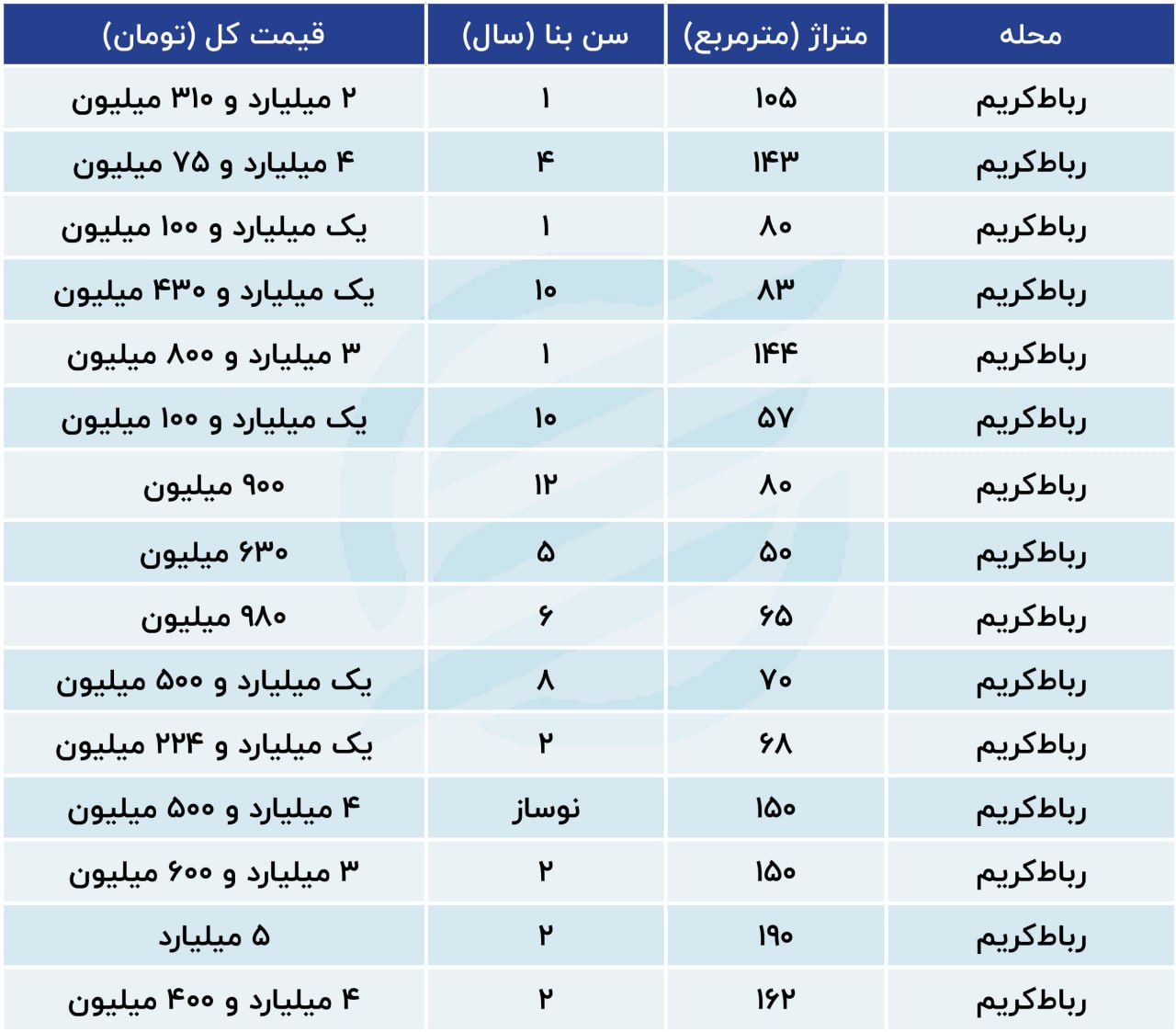 در رباط کریم، واحدی با 143 مترمربع زیربنا و 4 سال عمربنا، 4 میلیارد و 75 میلیون تومان و آپارتمانی دیگر با 57 مترمربع زیربنا و 10 سال ساخت، یک میلیارد و 100 میلیون تومان قیمتگذاری شده است. واحدی دیگر با 144 مترمربع مساحت و 1 سال ساخت، 3 میلیارد و 800 میلیون تومان و آپارتمانی دیگر با 65 مترمربع مساحت و 6 سال ساخت، 980 میلیون تومان به فروش میرسد.