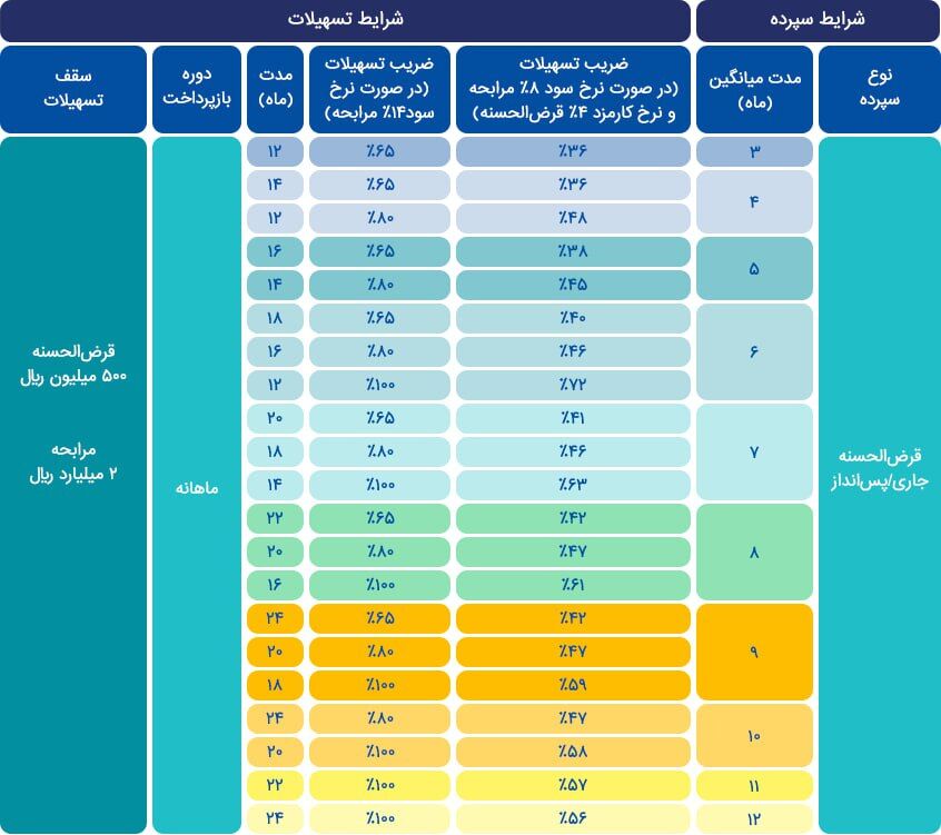 شرایط سپرده و تسهیلات قرض الحسنه/مرابحه با نرخ سود ترجیحی در طرح حامی مطابق با جدول ذیل است: