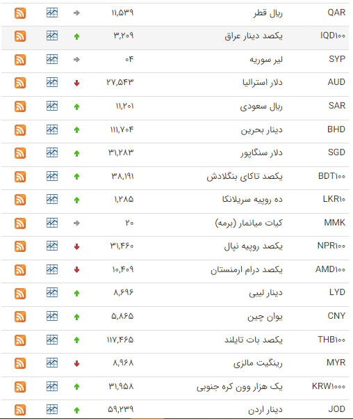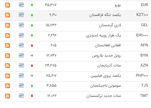 بر این اساس نرخ رسمی یورو، یکصد ين ژاپن، يکصد دينار عراق و یوان چين افزایش و نرخ پوند انگليس، دلار کانادا، لير ترکيه، دلار استراليا و افغانی افغانستان کاهش یافت.