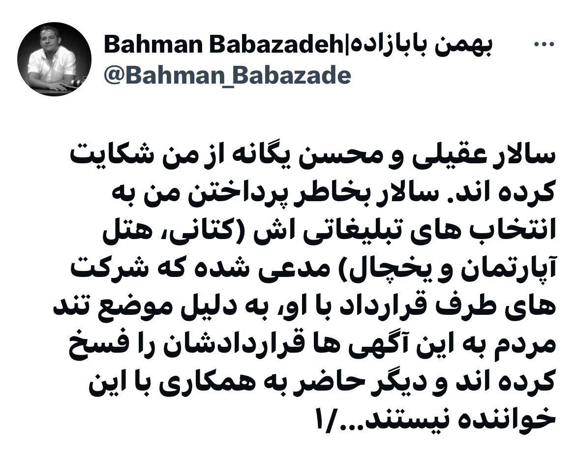بهمن بابا زاده در توئیتی از علت شکایت سالار عقیلی و محسن یگانه از خودش پرده برداشت.