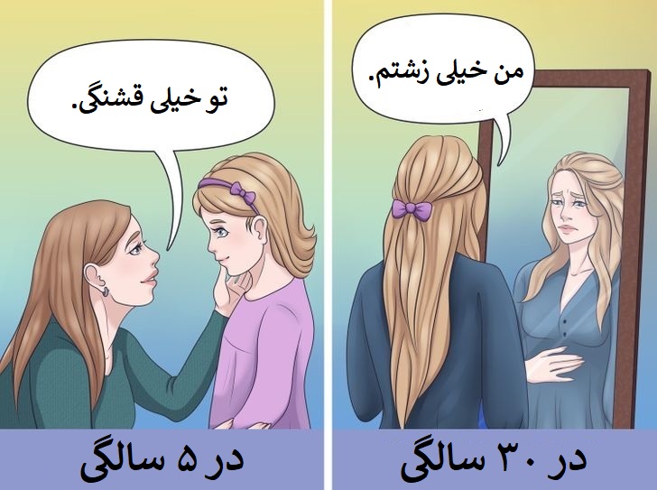 همه ی ما گاهی احساس کمبود اعتماد به نفس می کنیم و نمی توانیم کسی که دل مان می خواهد را در آینه ببینیم. اما برای فرزند، والدینش همیشه بهترین اند. بنابراین وقتی جلوی فرزندتان درباره ی نقص های ظاهری تان صحبت می کنید، نه تنها خودتان را در چشم او پایین می آورید، بلکه طرز فکری اشتباهی هم در فرزندتان درباره ی ظاهر خودش به وجود می آورید.
