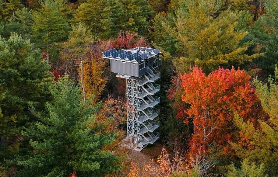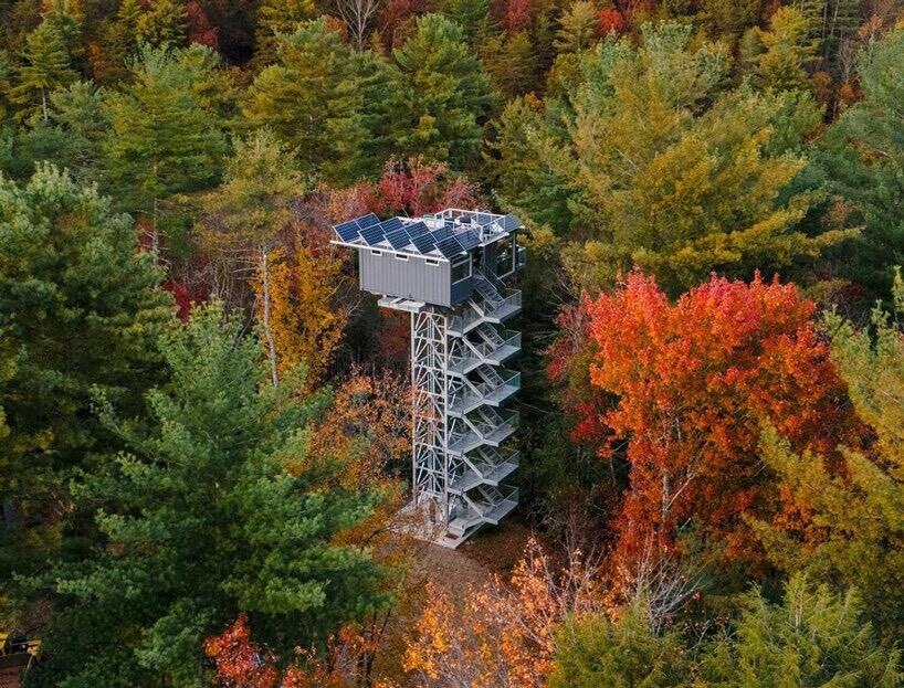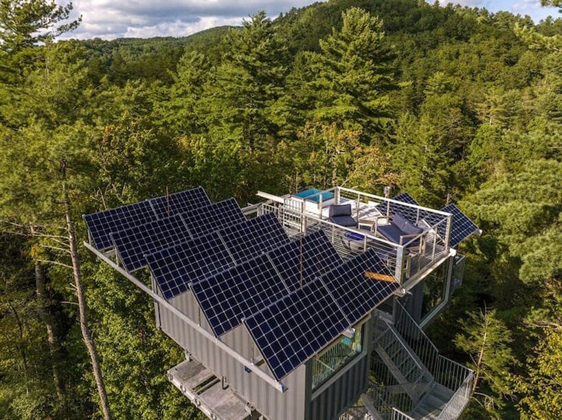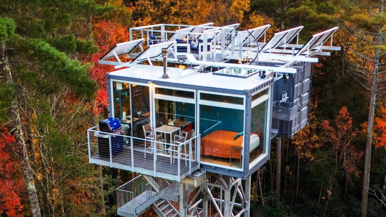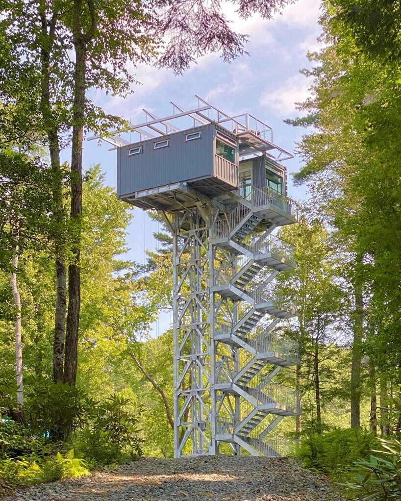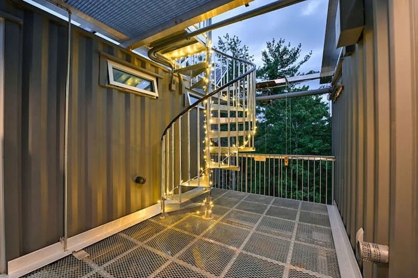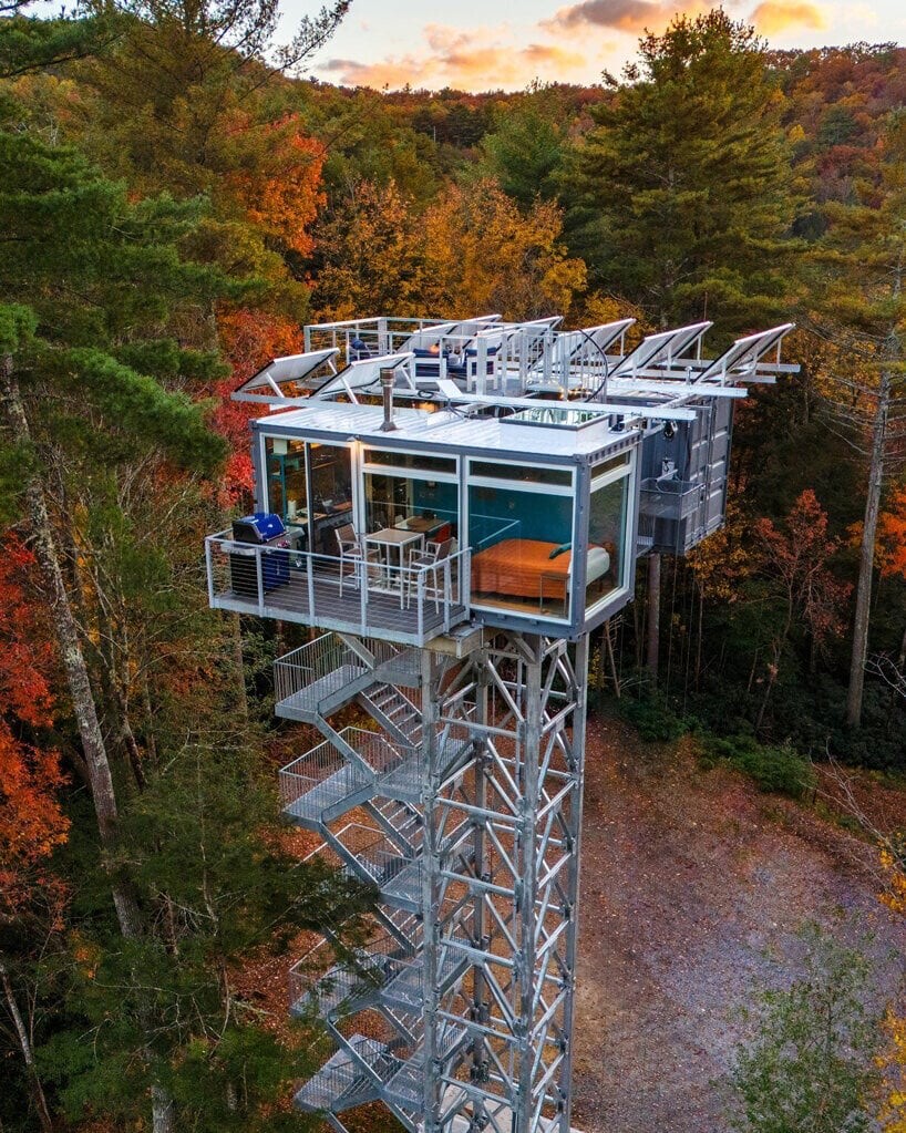 این اقامتگاه که با استفاده از دو کانتینر حمل و نقل ساخته شده و در ارتفاع ۱۸ متری بالاتر از سطح جنگل روی یک چارچوب فلزی باریک جای گرفته است، برای کسانی که به دنبال قطع ارتباط با فناوری و غوطه ور شدن در آرامش طبیعت هستند، مکانی آرام را فراهم می کند.