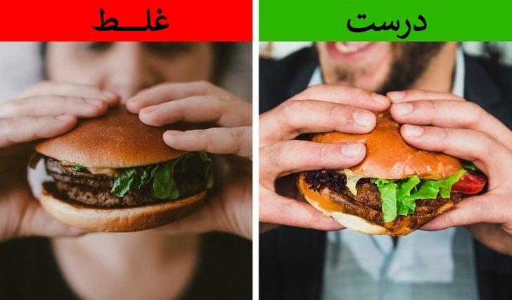یکی دیگر از مشکلات مربوط به خوردن همبرگر، سفت نگه داشتن آن است، چون این کار باعث می شود نان ساندویچ پاره شود و همه ی محتویات آن بیرون بریزد. همانطور که در تصاویر بالا نشان داده، بهترین کار این است که انگشتان شست و کوچک دست هایتان را در زیر ساندویچ قرار دهید و ۳ انگشت وسط را بالای ساندویچ بگذارید. البته باید ساندویچ را با هر دو دست نگه دارید که این امر خوردن همزمان سیب زمینی سرخ کرده را کمی سخت می کند.