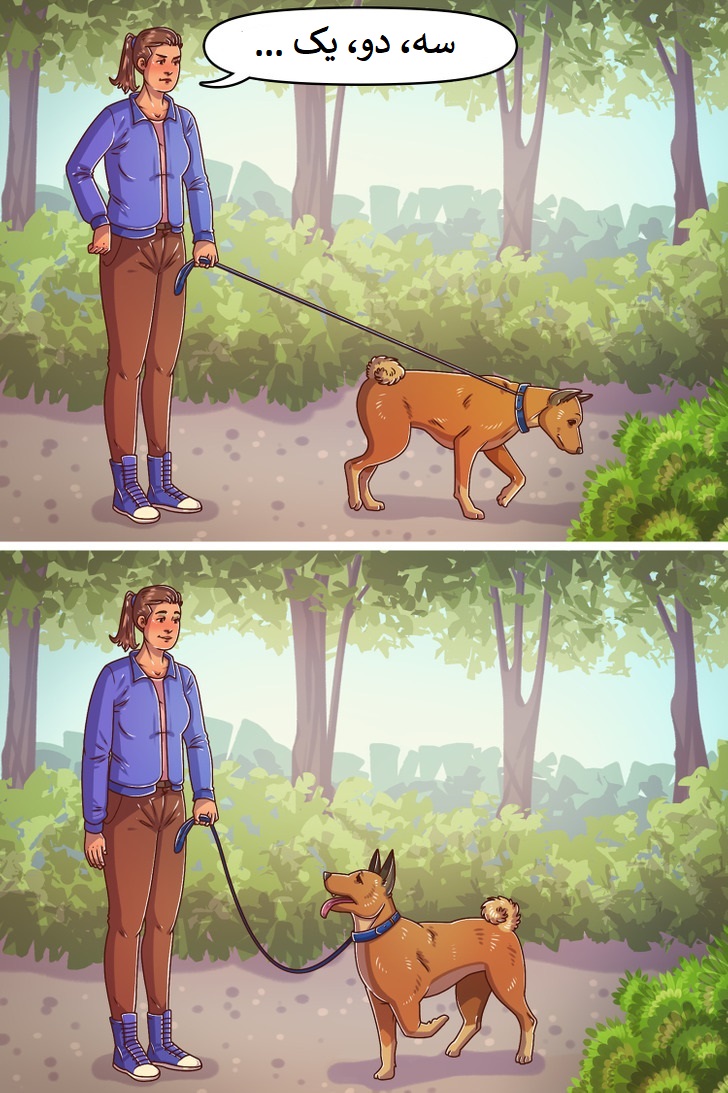 سگ ها با آموزش، زبان انسان ها را اندکی متوجه می شوند، بنابراین می توانید از شمارش معکوس برای کنترل سگ خانگی تان استفاده کنید. اگر هنگام پیاده روی با سگ تان، شروع به بو کشیدن کرد، به جای کشیدن قلاده که اضطراب زیادی به سگ وارد می کند، با صدای بلند سه شماره معکوس بشمارید. با این کار سگ تان پیش از تمام شدن شمارش، بو کشیدن را متوقف می کند.