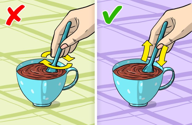با اینکه بیشتر ما همیشه برای حل کردن قند و شکر در چای و قهوه از شیوه ی هم زدن با حرکت دوار استفاده می کنیم، اما نحوه ی صحیح این کار هم زدن به شکل خطی است. این کار کمک می کند قهوه و چای کمتری به اطراف بپاشد و قند و شکر هم سریع تر حل شوند.