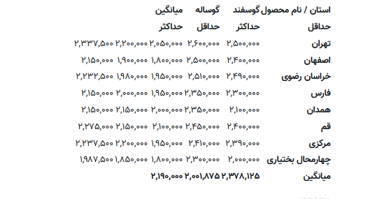 در بازار دام مشهد قیمت گوسفند زنده ۲۴۹ هزار تومان تا ۲۵۰ هزار تومان است که این بازار نیز افزایش ۱۹ هزار تومانی در هر کیلو داشته است.