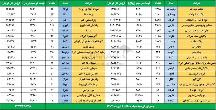 در پایان معاملات دیروز بازار سهام، ارزش سهام عدالت به ۱۴ میلیون و ۷۷۲ هزار و ۴۵۴ تومان رسید که نسبت به روز معاملاتی ۱۶ هزار و ۴۳۶ تومان معادل ۰.۱ درصد کاهش یافت.