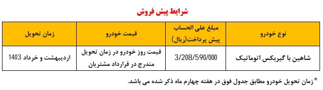 شرایط طرح پیش فروش شاهین اتوماتیک دی 1402 اعلام شد.