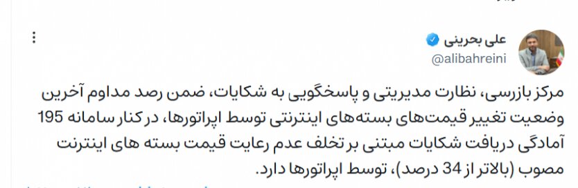 علی بحرینی رئیس مرکز بازرسی نظارت مدیریتی و پاسخگویی به شکایات وزارت ارتباطات و فناوری اطلاعات در ویراستی گفت: مرکز بازرسی، نظارت مدیریتی و پاسخگویی به شکایات، ضمن رصد مداوم آخرین وضعیت تغییر قیمتهای بستههای اینترنتی توسط اپراتورها، در کنار سامانه ۱۹۵ آمادگی دریافت شکایات مبتنی بر تخلف عدم رعایت قیمت بستههای اینترنت مصوب (بالاتر از ۳۴ درصد)، توسط اپراتورها دارد.