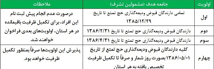 واجدین شرایط تشرف به این سفر مقدس، میتوانند ضمن انجام برنامهریزی لازم و بروزرسانی اطلاعات خود در سامانه reserve.haj.ir نسبت به اخذ کد رهگیری و تکمیل مدارک خویش، بهویژه تهیه گذرنامه دارای اعتبار اقدام کنند؛ اولویتهای تعیین شده نیز در جدول زیر قابل مشاهده است: