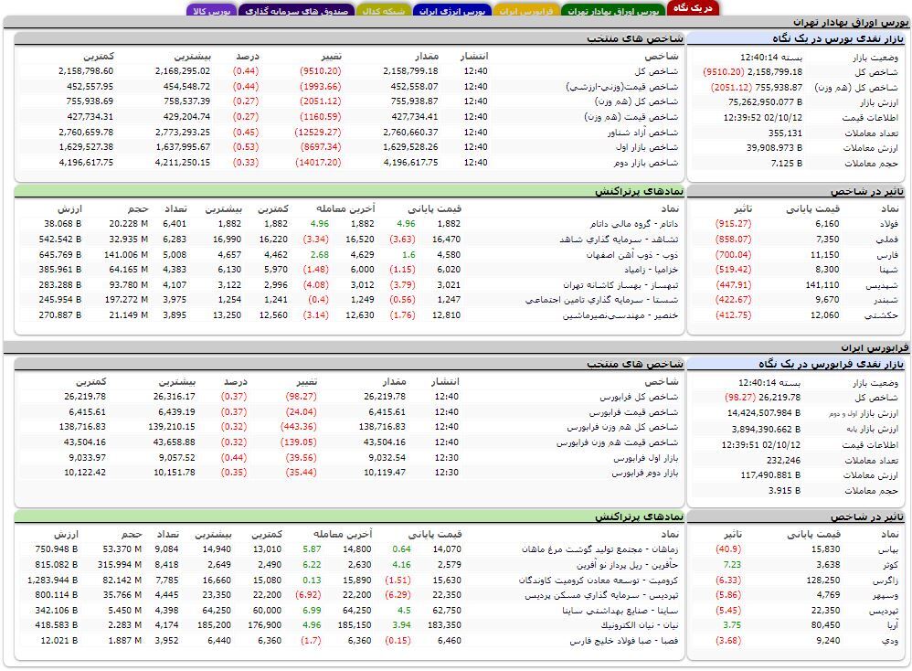 به گزارش سایت طلا، بورس اوراق بهادار تهران امروز هم در یک روند کاهشی قرار گرفت، به گونهای که شاخص کل بورس در پایان معاملات با کاهش 9509 واحد نسبت به روز گذشته به رقم 2 میلیون و 158 هزار و 799 واحد رسید.
