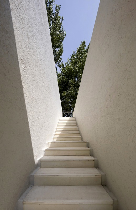 یک پلکان باریک و سپید که احساسی ماورائی و رازآلود در خودش دارد، نمای روبه روی ساختمان را به فضای پشت بام متصل میکند. این پلکان در کنار ورودی جلو آمدۀ ساختمان که حالتی بین یک طاق نصرت و دالان را تداعی میکند، نمای چشمگیر و تاثیرگذاری برای ساختمان ایجاد کرده است.