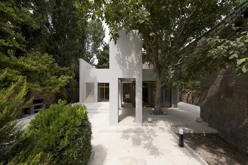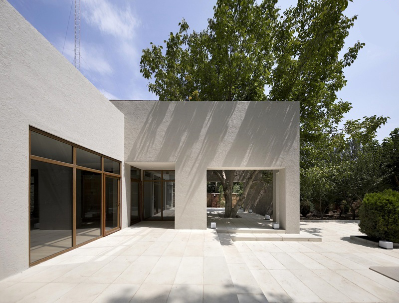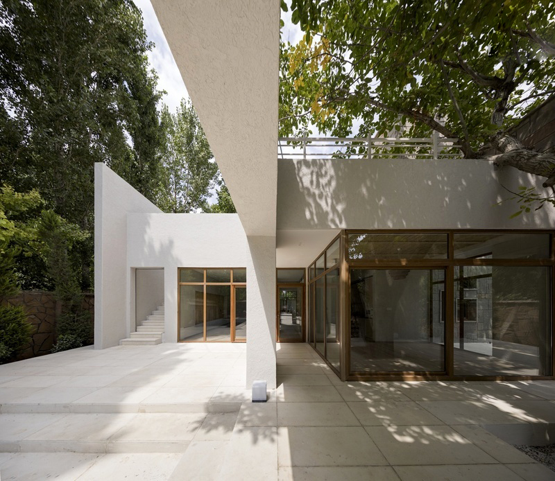 اما چشمنوازترین و متفاوتترین ویژگی این بنا فضاهایی هستند که برای در بر گرفتن درختان گردوی اطراف بنا شکل گرفتهاند؛ فضاهایی بینابینی که نه کاملا درونی هستند و نه کاملا بیرونی. این فضاها در عین اینکه دقیقا درون خانه نیستند اما باعث شدهاند درختها تا حد زیادی بخشی از درون خانه به حساب بیایند؛ یک حالت مرزی خوشایند که کل خانه را به چیزی زنده و پویا تبدیل کرده است.