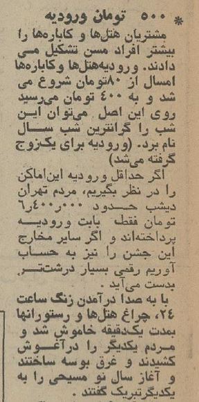 در دی ماه سال ۱۳۵۲ همزمان با آغاز سال نو میلادی در تهران در بسیاری از هتلها و مراکز تفریحات شبانه جشن برپا شد. روزنامه اطلاعات در ۱۱ دی ۱۳۵۲ در گزارشهایی انتقادی از حضور مردم تهران در این جشنها نوشت. از ورودی گران و ناهمگونی فرهنگی مردم تهران با چنین مراسمی و... بخشهایی از گزارش را بخوانید و عکسهایش را تماشا کنید.