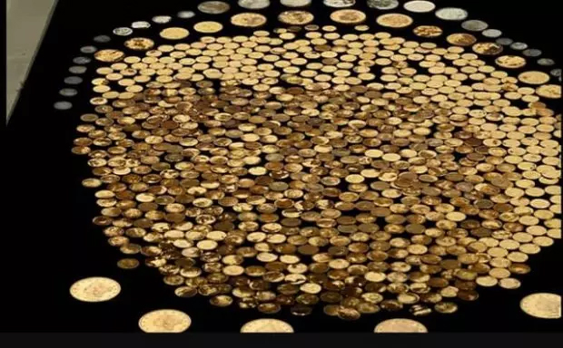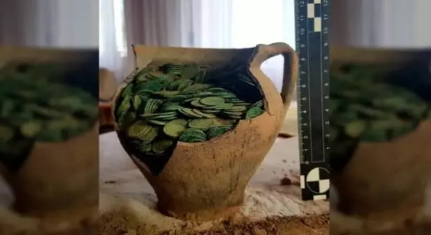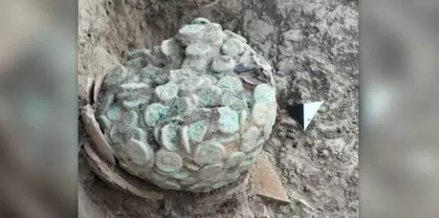 کارگر مزرعه که با فلزیاب خود مشغول گشتن به دنبال بخشهای جدا شده از تراکتور بود، به شکل غیرمنتظرهای یک کوزه سفالی حاوی هزار عدد سکه مسی را زیر خاک سطحی کشف کرد. این کوزه محلی بزرگ یک دسته و گردنی باریک داشت و هزار سکه مسی متعلق به قرن ۱۷ را در خود جای داده بود. دانشمندان میگویند محتویات کوزه در زمان دفن ارزشی نداشته و صاحبش میتوانسته آن میزان وجه مسکوک را با یک جفت دمپایی هم عوض کند.