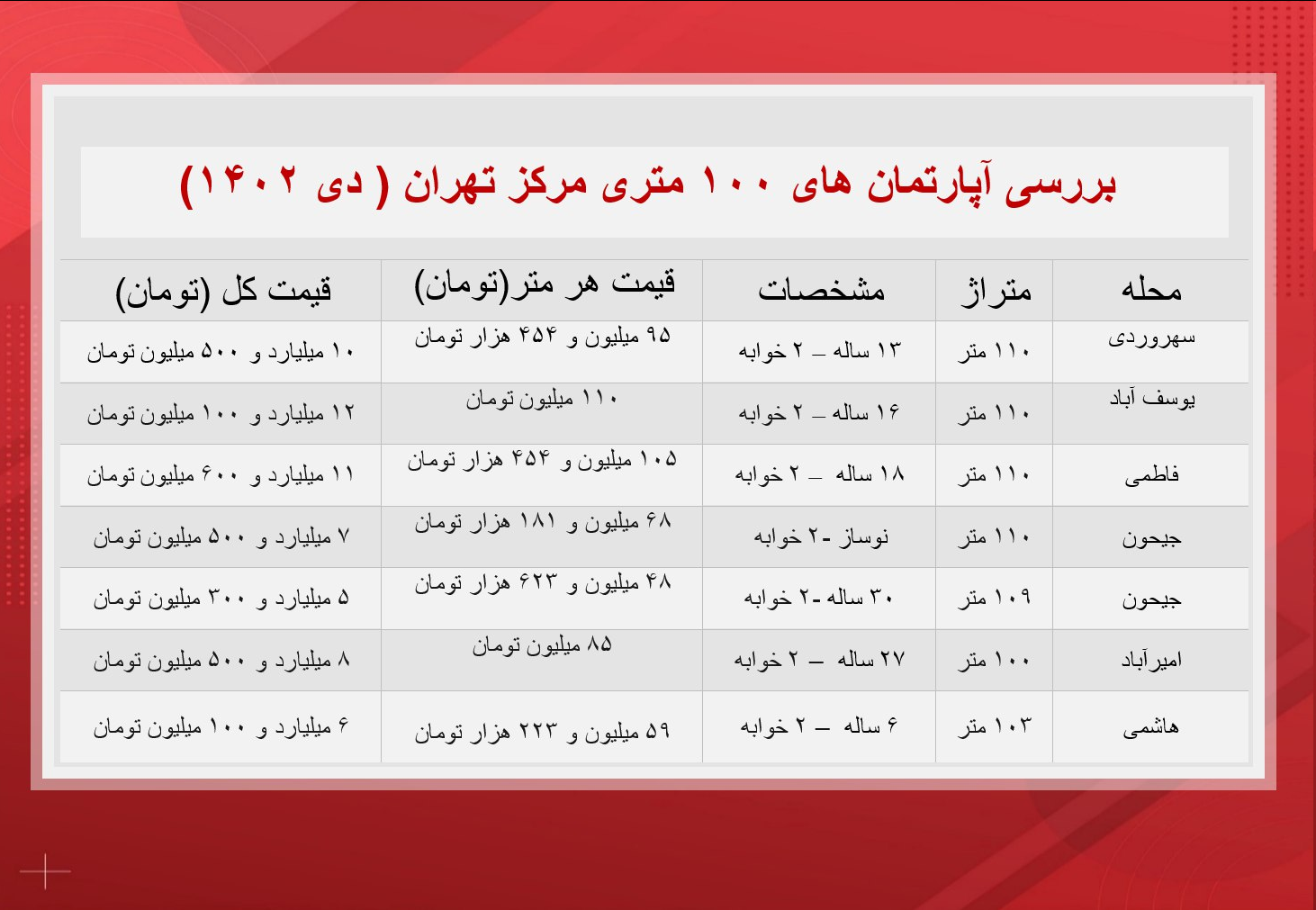 آپارتمانهای ۱۰۰ متری قلب تهران چند؟+ جدول قیمت