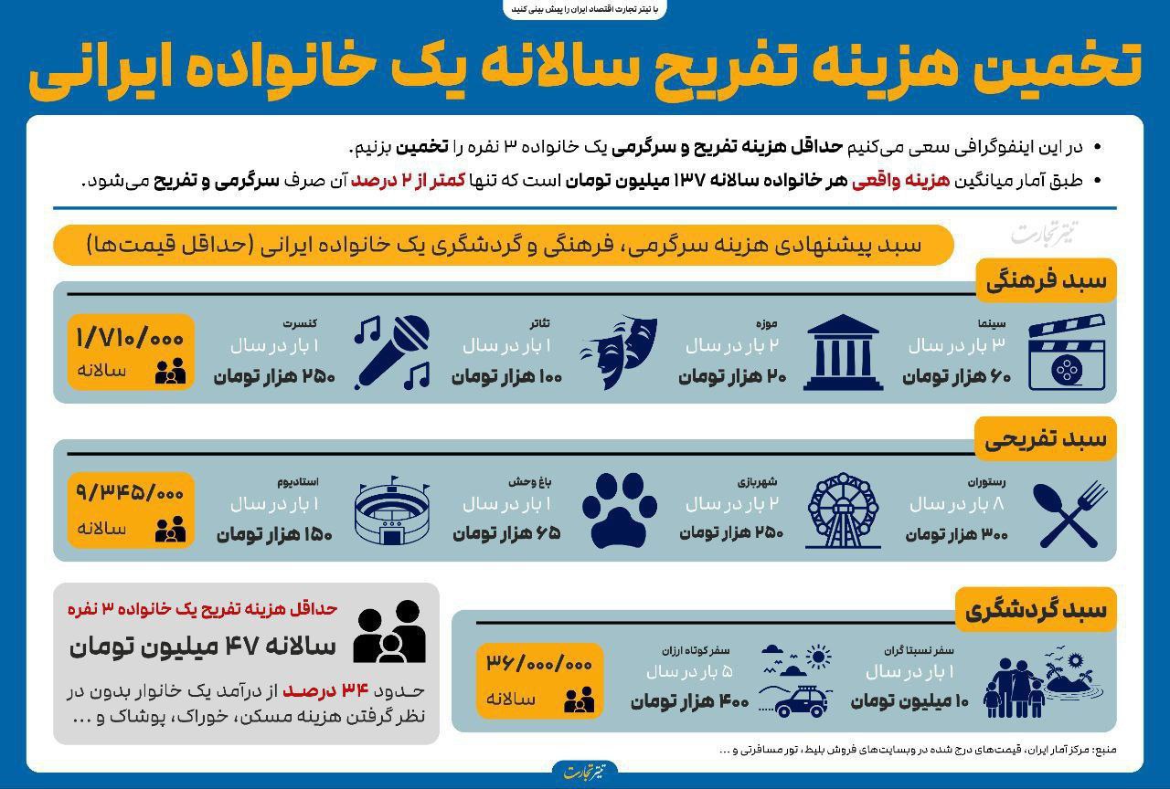 در این اینفوگرافی حداقل مخارج محصولات فرهنگی، سرگرمی و گردشگری یک خانواده ۳ نفره ایرانی تخمین زده شده است.