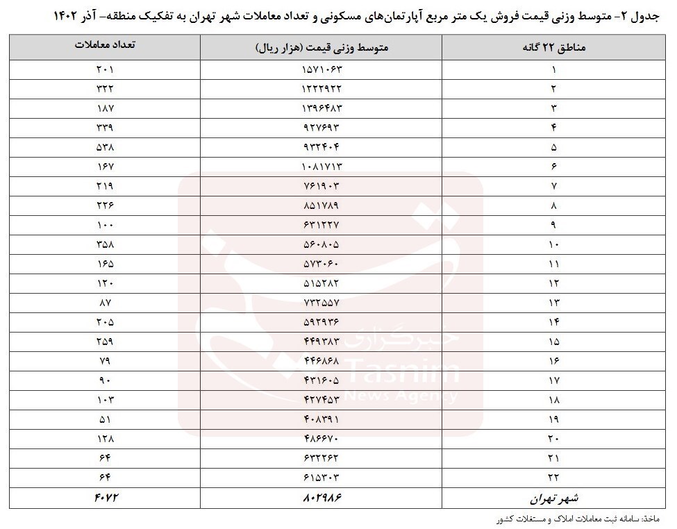 در آذر ماه ۱۴۰۲ شاخص قیمت آپارتمانهای مسکونی شهر تهران به عدد ٢٧٤,٤ رسیده است که نسبت به ماه قبل (٢٨٢.٥)، ٢.٩ درصد کاهش داشته است.
