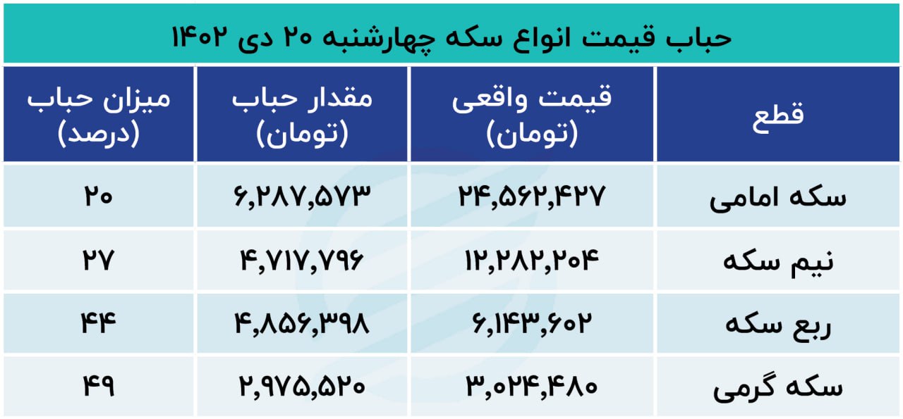 قیمت سکه در معاملات پشت خطی سهشنبه شب در حدود ۳۰ میلیون و ۸۵۰ هزار تومان به فروش رسید. پیشبینیها در مورد قیمت سکه در روز چهارشنبه دو دسته است. برخی میگویند با افزایش حباب سکه احتمال اصلاح وجود دارد و ممکن است سکه به سمت نیمه کانال ۳۰ میلیون تومان عقبنشینی کند. با این حال برخی هم با اشاره به رفتار بازیگران ارزی در پشتخط سهشنبه میگویند این احتمال وجود دارد که سکه به کانال جدید سرک بکشد.