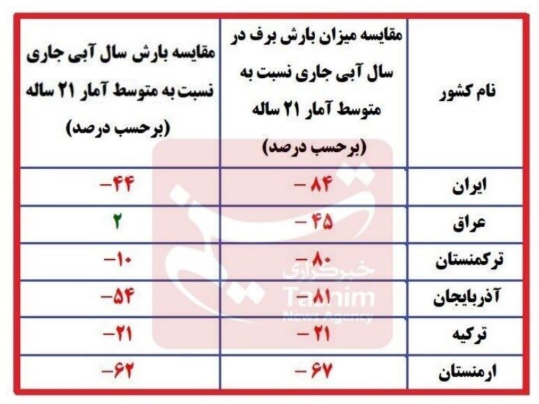 آمار مقایسهای بارش برف (بر اساس آب معادل برف) از ابتدای سال آبی جاری تا ششم دیماه امسال و همچنین میزان بارشهای هر کشور در این مدت در مقایسه با مدت مشابه متوسط ۲۱ ساله در کشورهای مختلف در جدول زیر ارائه شده است.