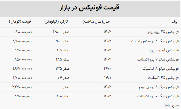 به گزارش سایت طلا، قیمت فونیکس مدیران خودرو در بازار آزاد چندهفته ای است که صعودی شده است. بر اساس قیمت محصولات مدیران خودرو امروز ، قیمت فونیکس FX پریمیوم صفر با افزایش ۱۲۵ میلیونی در دو هفته به یک میلیاردو۹۰۰ میلیون تومان رسیده است. همچنین قیمت تیگو ۸ پرومکس اکسلنت نیز ۹۰ میلیون بالا رفته است و ۲ میلیاردو۷۰۰ میلیون تومان است. قیمت فونیکس تیگو ۷ پرو اکسلنت نیز با صعود ۲۰۰ میلیونی در یک هفته یک میلیاردو۸۵۰ میلیون تومان شده است. قیمت شاسی بلند مدیران خودرو مدل تیگو ۸ کلاسیک سال ۱۴۰۰ نیز با جهش ۱۳۵ میلیونی به یک میلیاردو۹۷۰ میلیون تومان رسیده است. قیمت فونیکس FX اکسلنت سال ۱۴۰۱ نیز ۱۰۴ میلیون بال رفته است و یک میلیاردو۷۰۰ میلیون تومان است.