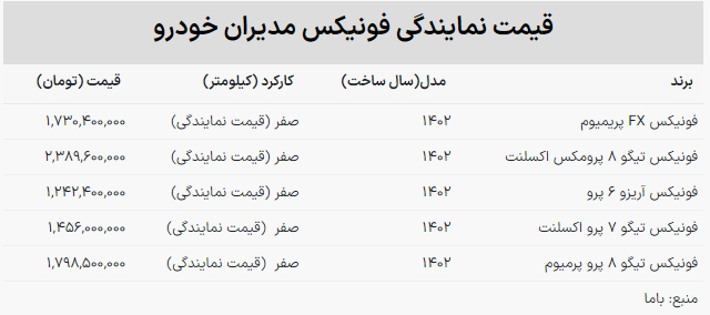 قیمت کارخانه فونیکس مدیران خودرو برای مدل تیگو ۸ پرو پرمیوم یک میلیاردو۷۹۸ میلیون تومان است. قیمت نمایندگی مدیران خودرو برای فونیکس آریزو ۶ پرو هم یک میلیاردو۲۴۲ میلیون تومان است. قیمت نمایندگی فونیکس تیگو ۷ پرو اکسلنت نیز یک میلیاردو۴۵۶ میلیون تومان اعلام شده است.