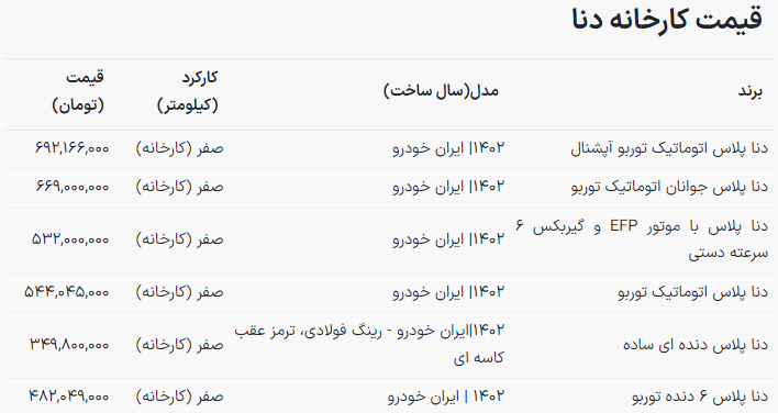 بر اساس قیمت محصولات ایران خودرو ، قیمت کارخانه دنا پلاس جوانان اتوماتیک توربو حوالی ۶۶۹ میلیون تومان تصویب شده است. همچنین قیمت دنا پلاس در کارخانه برای مدل اتوماتیک توربو نیز ۵۴۴ میلیون است.