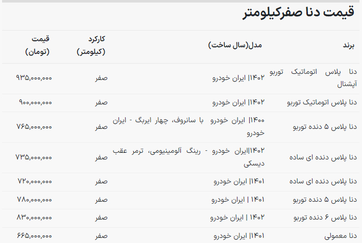 به گزارش سایت طلا، افزایش قیمت دنا صفر در بازار آزاد طی سه هفته گذشته رکورد زده است. بر اساس قیمت محصولات ایران خودرو، قیمت دنا پلاس اتوماتیک توربو آپشنال به ۹۳۵ میلیون تومان رسیده است که نسبت به اول دی ماه ۸۵ میلیون تومان بالا رفته است. در صورت تداوم افزایش قیمت خودرو در ماههای پایانی سال به نظر می رسد باید منتظر ورود این خودرو به کانال یک میلیاردی باشیم. همچنین قیمت دنا اتومات پلاس توربو نیز ۹۰۰ میلیون تومان است و در مدت گفته شده ۹۰ میلیون تومان گران شده است. قیمت صفر دنا معمولی نیز با افزایش ۶۵ میلیونی در مدت گفته شده در بازار امروز خودرو حوالی ۶۶۵ میلیون تومان است. همچنین قمیت دنا پلاس ۶ دنده توربو نیز با صعود ۹۰ میلیونی به ۸۳۰ میلیون تومان رسیده است.