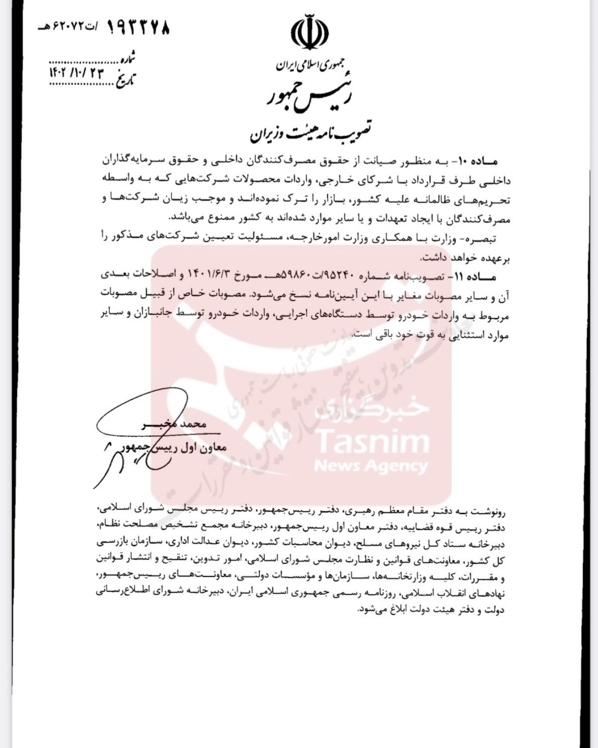 هیئت وزیران در جلسه ۱۴۰۲.۱۰.۱۰ به پیشنهاد وزارت صنعت، معدن و تجارت و به استناد اصل یکصد و سی و هشتم قانون اساسی جمهوری اسلامی ایران و ماده (۴) قانون ساماندهی صنعت خودرو مصوب ۱۴۰۰ و اصلاحات بعدی آن، آیین نامه واردات خودروهای نو را به شرح زیر تصویب کرد: