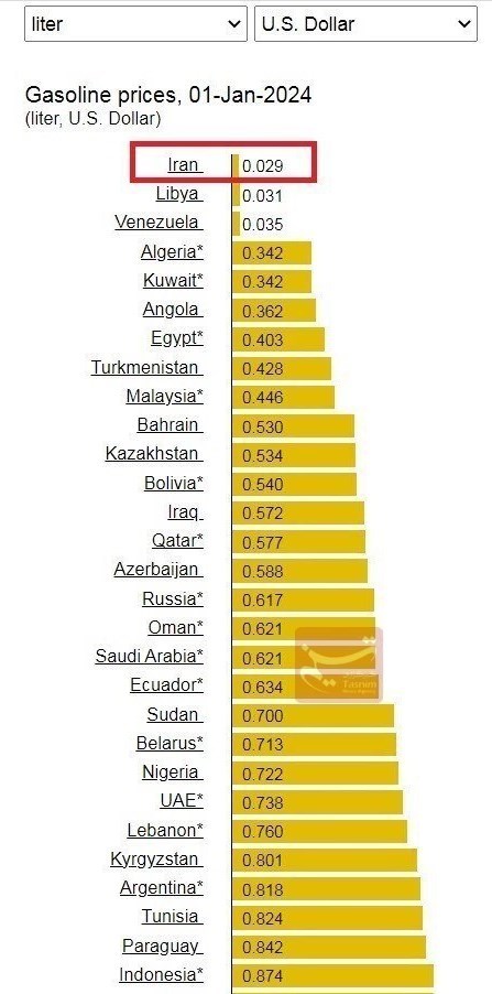 جدیدترین آمارها از قیمت بنزین در دنیا نشان می دهد ارزان ترین بنزین دنیا در ایران عرضه می شود و قیمت هر لیتر بنزین در کشورهای همسایه ایران تا ۴۰ برابر قیمت این محصول در ایران است.