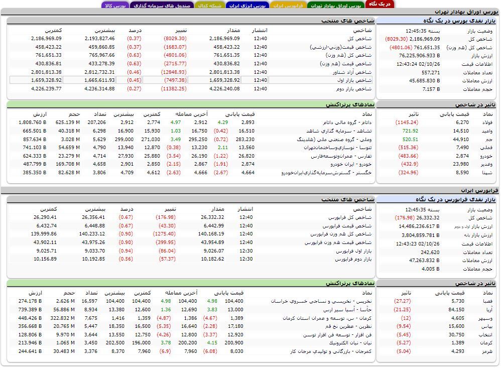 در فرابورس ایران هم شاخص کل امروز با 176 واحد کاهش به رقم 26 هزار و 332 واحد رسید. ارزش روز بازار اول و دوم فرابورس که ناشی از شرکتهای فرابورسی این دو بازار است به بیش از یک میلیون و 448 هزار میلیارد تومان رسید.