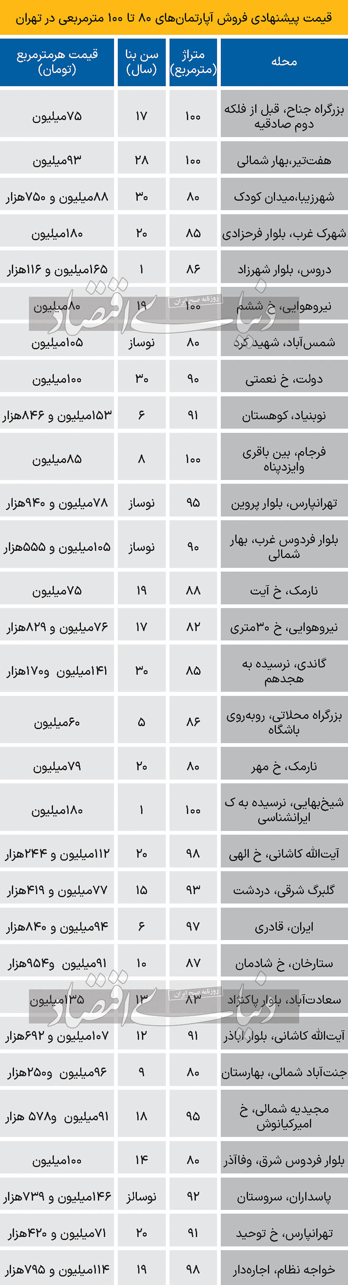قیمت آپارتمانهای 80 تا 100متری در تهران چند +جدول قیمت