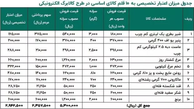 پیش از این ۹ قلم کالا شامل پنیر، شیر کم چرب، تخم مرغ، گوشت مرغ، روغن مایع، ماکارونی، برنج ایرانی، ماست و قند و شکر این طرح پیش بینی شده بود و مردم میتوانستند با استفاده از اعتبار یارانه خود در هر ماه این اقلام را از هر عنوان و برند و نشان تجاری خریداری کنند ولی در حال حاضر با افزوده شدن اقلام پروتئینی، حبوبات و گوشت منجمد گوساله امکان خرید ۱۱ قلم کالای اساسی برای متقاضیان فراهم شده است.