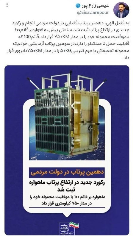 مرکز روابط عمومی و اطلاع رسانی وزارت ارتباطات در این باره اعلام کرد ماهواره بر قائم 100، ماهواره بومی ثریا از سری ماهواره های تحقیقاتی SRI ساخت پژوهشگاه فضایی ایران را با موفقیت در مدار 750 کیلومتری زمین قرار داد تا رکورد جدیدی از نظر ارتفاع پرتاب ماهواره در کشور به ثبت برسد.