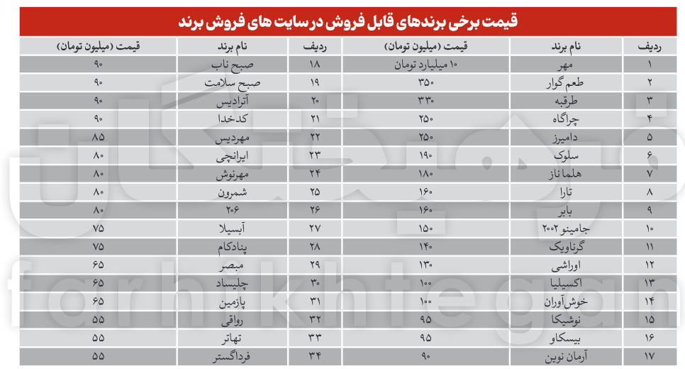 علاوهبر هفتخوان رستم ثبت برند، بازار سیاه دیگری نیز شکل گرفته که در آن «اسامی آماده برندها» به فروش میرسند. ماجرا از این قرار است که اگر بخواهید نام برند خود را ثبت کنید اغلب نامها توسط افرادی که تولید ندارند ثبت شده و در بازار سیاه موجود است و به فروش میرسند. یکی از شرکتهای واسط میان افرادی که برند ثبت کردند و متقاضی است ادعا میکند برندهای ثبتشدهای دارد که قیمت آنها از ۱۵۰ تا ۱۶۰ میلیون تومان شروع میشود و به ارقام ۵۰۰، ۶۰۰ و ۷۰۰ میلیون تومان و حتی بالغ بر یک میلیارد تومان نیز میرسد. برعکس خودرو که هرچه کمتر کار کرده باشد قیمت بیشتری دارد، قیمت یک برند کارکرده کمتر از چهار تا پنج میلیارد تومان نخواهد بود. بله، درست خواندید، قیمت یک برند کارکرده به اندازه یک واحد آپارتمان ۹۰ تا ۱۰۰ متری در مناطق ۴ تا ۲۲ شهر تهران به فروش میرسد؛ حال بماند که علاوهبر دلالی که برند را برای فروش ثبت کرده، شرکتی که واسطه شده نیز پول هنگفتی از بازار سیاه کسب میکند.