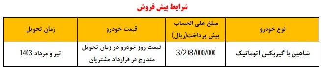 شرایط طرح پیش فروش خودرو شاهین اتوماتیک در بهمن 1402 اعلام شد.