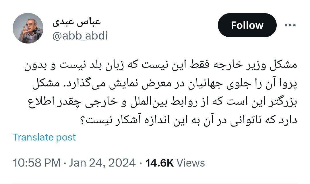 عباس عبدی به انگلیسی صحبت کردن حسین امیرعبداللهیان، وزیر امور خارجه واکنش نشان داد.
